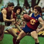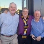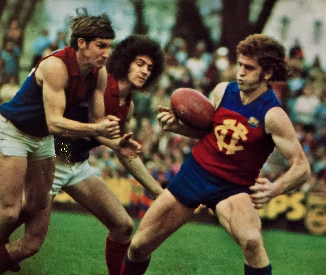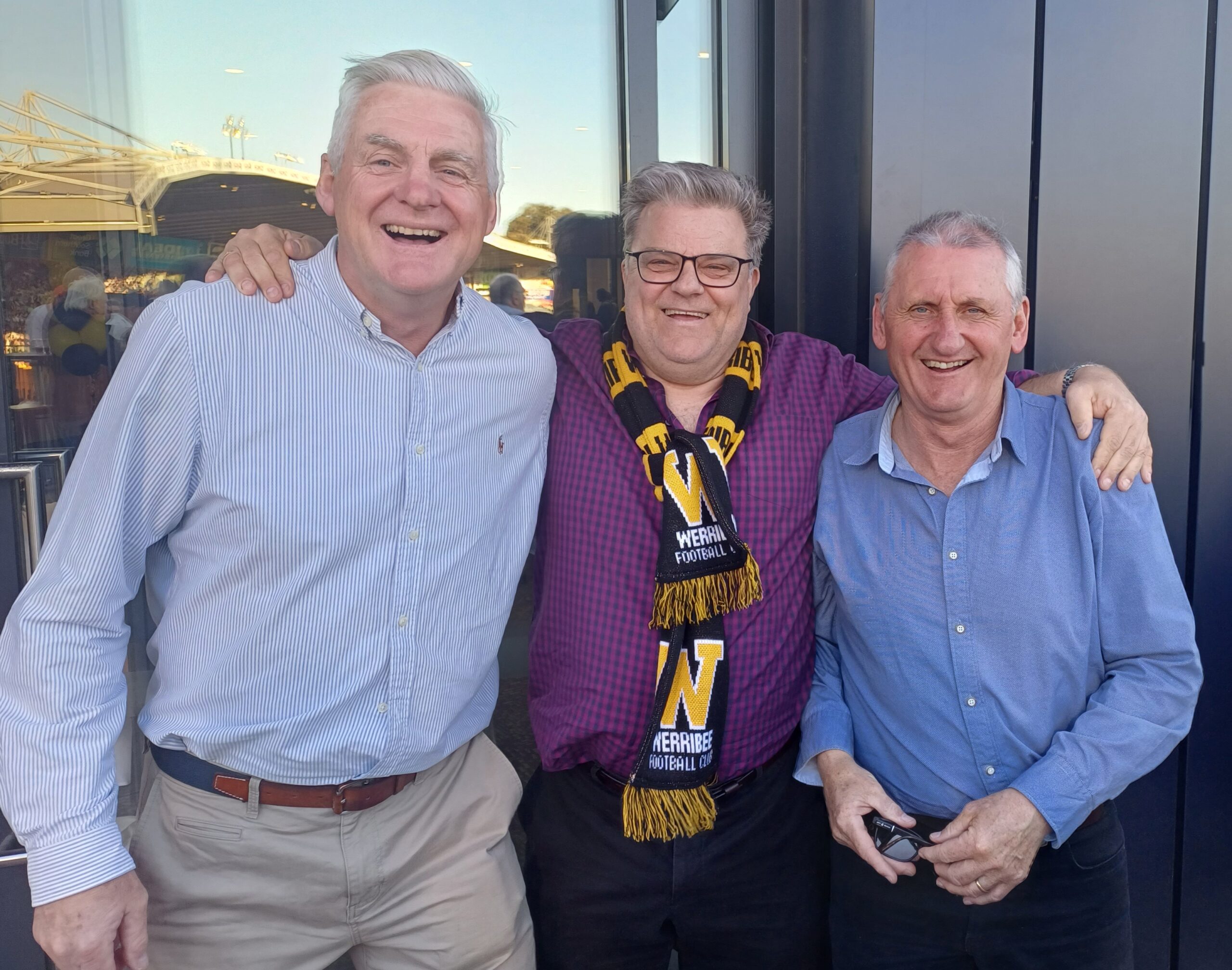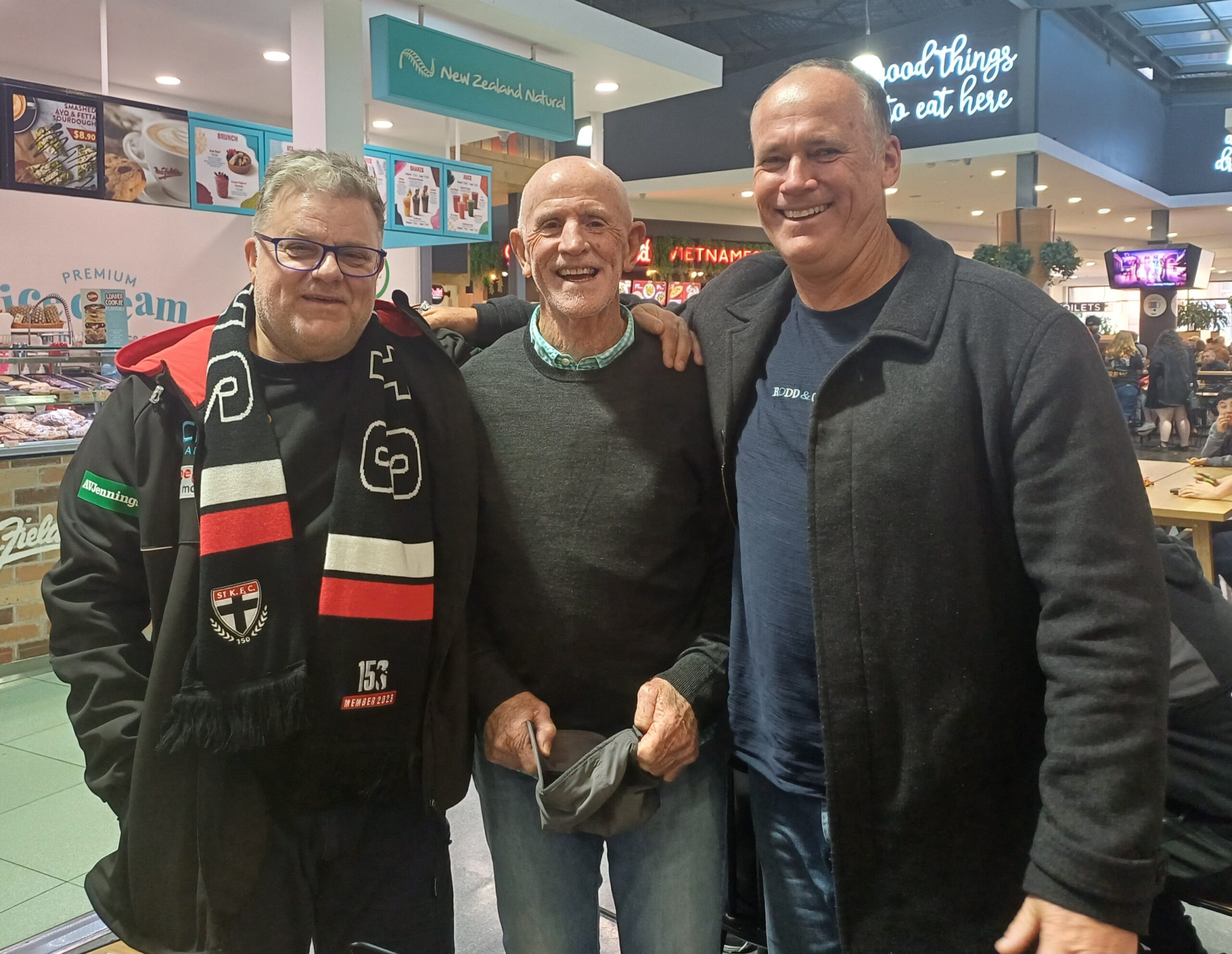 - Kevin O’Keefe. I know I’ll never hear the end of this but ‘Kezel’ fits this category of Reverend for me. We played in two QAFL premierships together for Coorparoo but I’ve always been a bit nervous around him. Not scared, just a bit on edge. I always found it difficult to get close to Kezel but I know he’d be the first to have your back. I respect him to the point of adoration maybe, I’m not sure, but one thing is a constant with the ‘K Man’, he gives very little away. Many I’m sure will remember the accidental collision in 1977 he had with Neil Sachse and even in Neil’s biography by Michael Sexton, ‘Playing On’, Kezel said very little. I can only imagine what it must have been like for him over these years dealing with that tragic day, but what I can say is that Kezel and Neil became great friends prior to Neil’s death in 2020. Being the fitness fanatic he is, Kezel was involved in fund raising bike rides for Neil’s Centre For Spinal Research which raised hundreds of thousands of dollars. One of ten kids from the Western District in Victoria, clearly with no television, Kezel, was a great team mate, fearless and an unstoppable force on and off the ground. Yeah…ok, he’s a Reverend and I’ll cop it at our next lunch for sure. This is him flanked by myself and one of his Coorparoo proteges, champion defender Greg Page in Melbourne last year. Kezel also played a significant mentoring role with two other young local stars at the time, Michael Gibson and Jason Dunstall who were both drafted after the 1984 premiership.