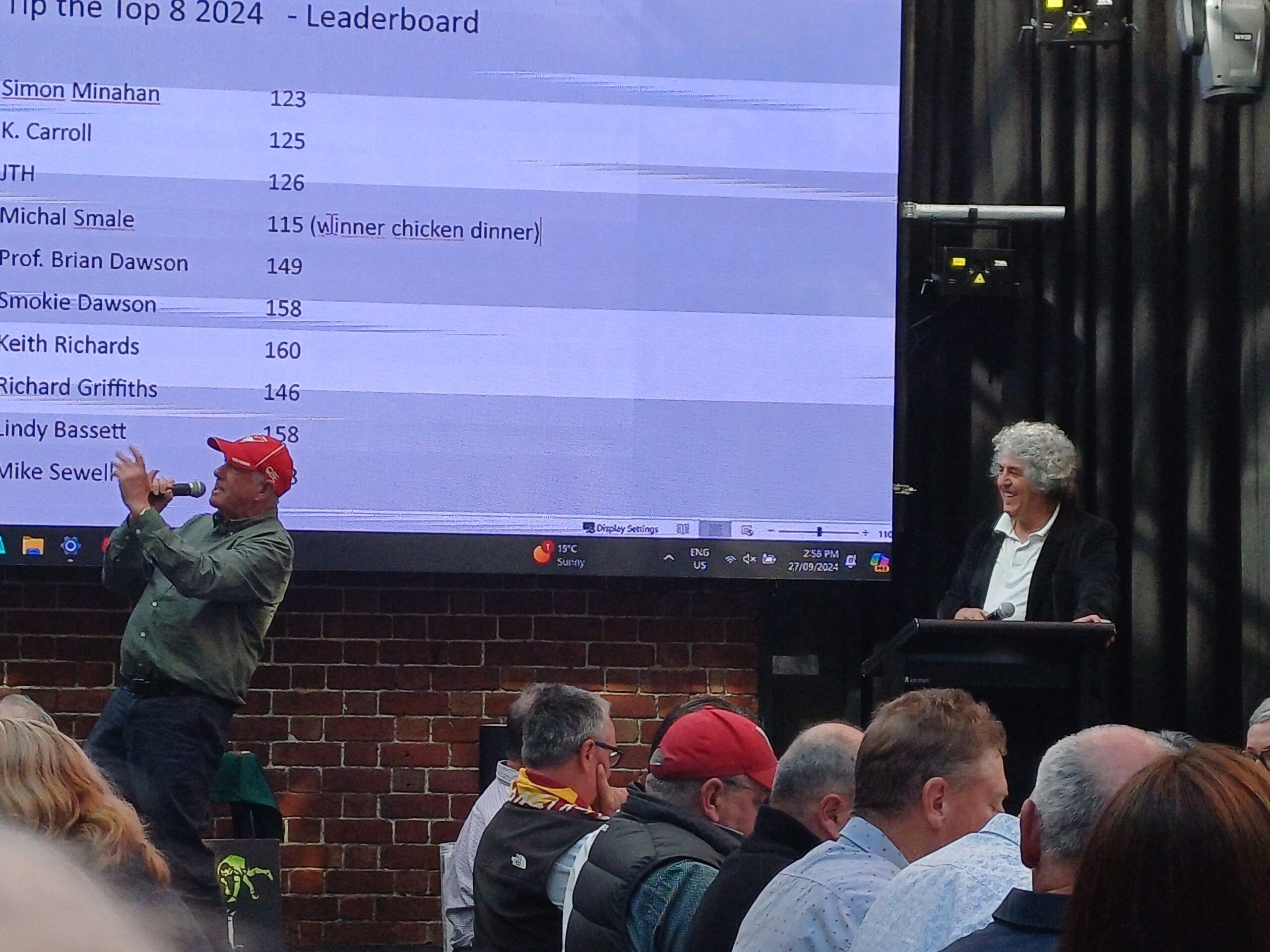 - John Harms. Author, broadcaster, teacher, historian and founder of The Footy Almanac, a vehicle for passionate writers and hacks like myself to publish stories. Again I’ve only had a few interactions with John but I doubt whether I’ve met a more caring and engaging person in my life. I’m sure the Almanac community, most of whom have been contributing for 20+ years would all say the same. He organises lunches and events from his base in The Barossa and is a master MC. He has been doing a final edit on my partner Lynda’s book and she can’t speak highly enough of his mentoring and professionalism. Whether it’s John’s faith or maybe it’s his immaculate bouffant of curls on his noggin, I’m not sure but there’s something special about this Reverend, even if he does barrack for the Cats. This is John in his element MC’ing an Almanac Grand Final Eve lunch.