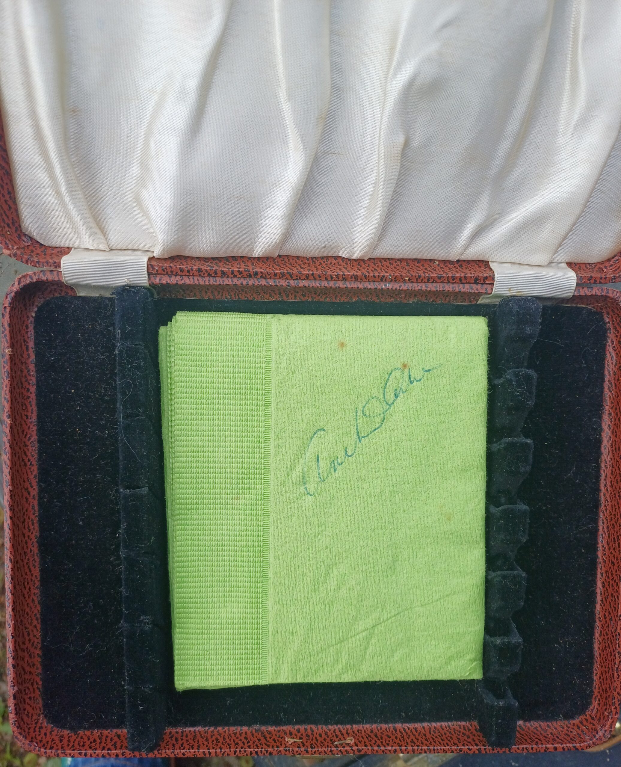 So I was going through some old stuff in the garage last weekend and found the serviette. My mum had kept it in some old flat jewellery case she picked up at an op shop and it’s been there for fifty years.