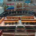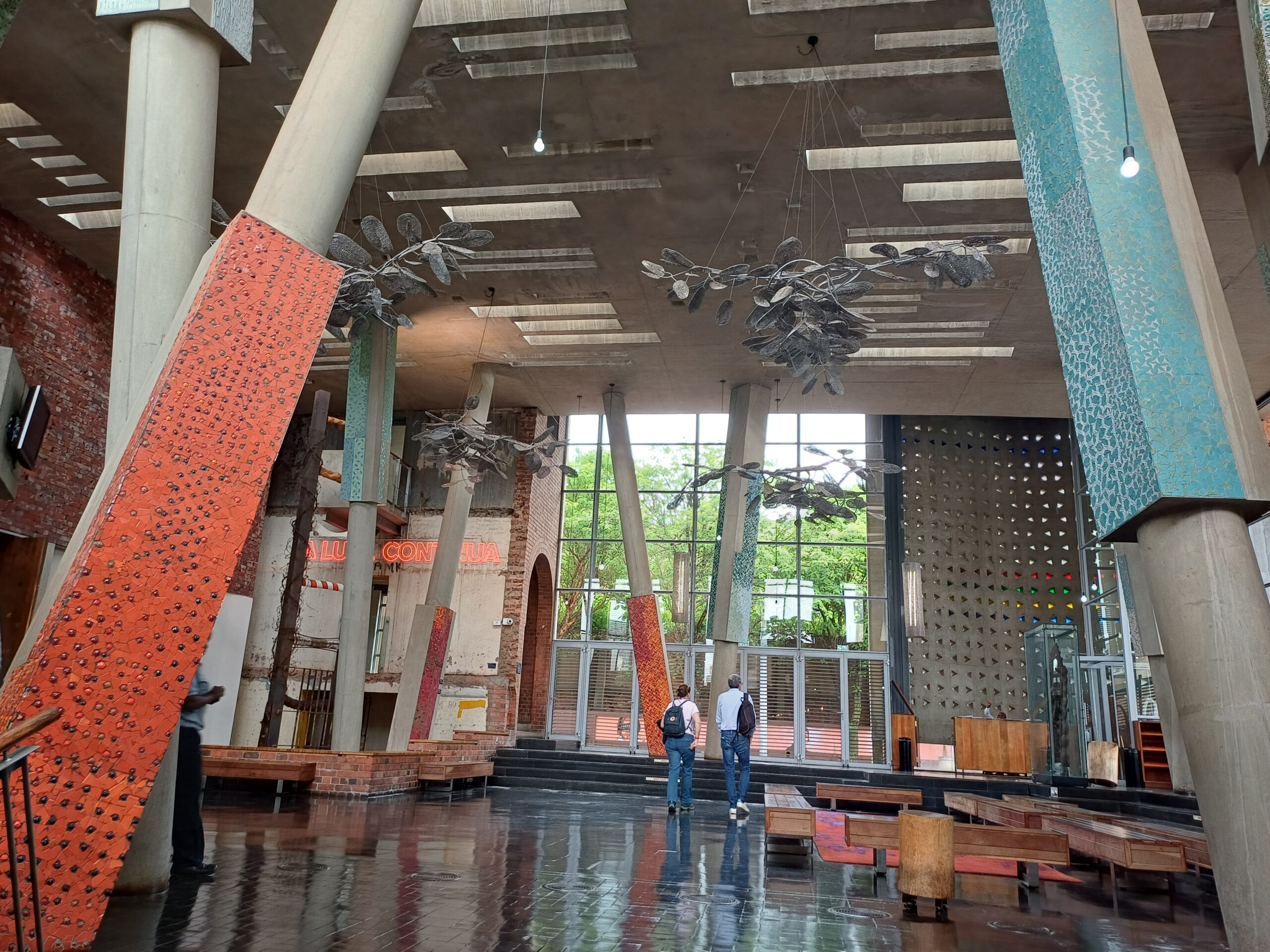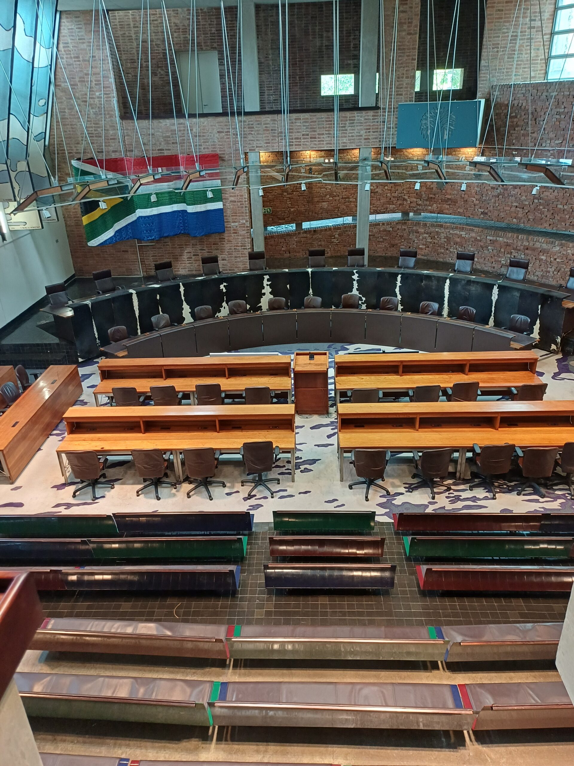 Attached to the prison is the stunning Constitutional Court which I think is the highest court in SA. There’s room for eleven judges and eleven assistants where the cases and the points of law are discussed without the accused being there. Each case is televised twice a week and the public is free to attend.